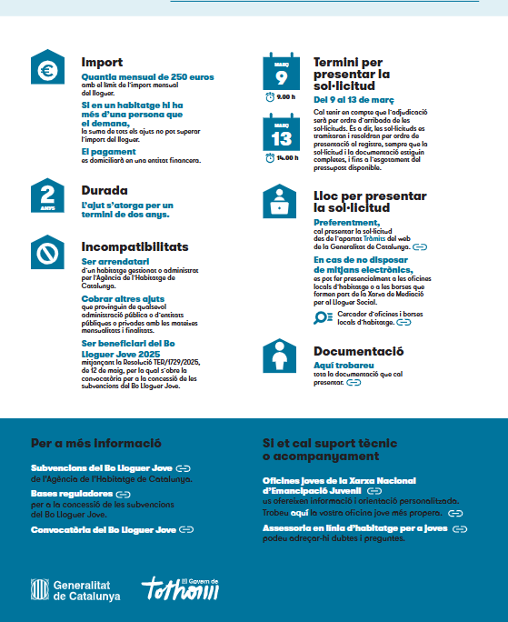 Joves de fins a 35 anys (nascuts després del 31/01/1989) que siguin titulars d’un contracte de lloguer o cessió d’ús d’un habitatge o habitació ubicat a Catalunya, que constitueixi el seu domicili habitual i permanent.
